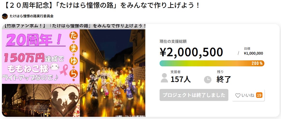 このまちづくりプロジェクトはファーストゴールを達成した12時間後にセカンドゴールも達成してしまうほどに勢いがあったプロジェクトで、最終的にはセカンドゴールを大きく上回る150万円を達成しています。