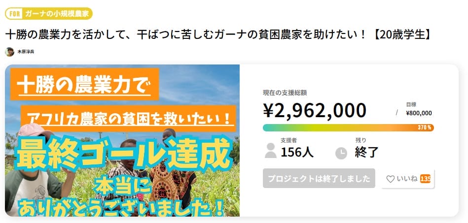 このプロジェクトは、ガーナの小規模農家の生活改善と食糧問題の解決を目指すもので、多くの人々の共感と支援を集めました。