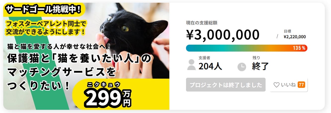 このクラウドファンディングでは、多くの支援者のもと目標2,220,000円に対し、3,000,000円の支援を集め、達成率は約135%となりました。