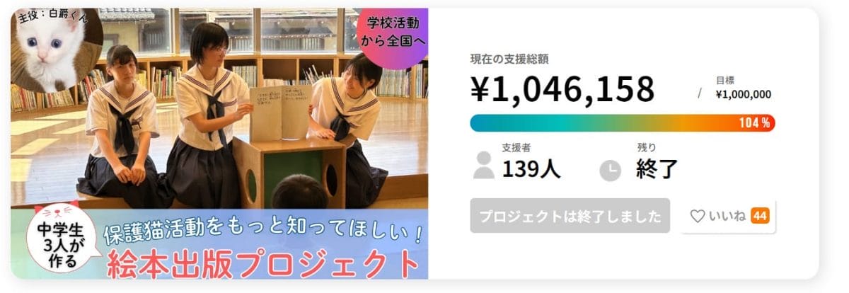 リターンとしてオリジナルの絵本が支援者に送られ、目標100万円に対し、支援金は1,046,158円集まり目標を達成しました。