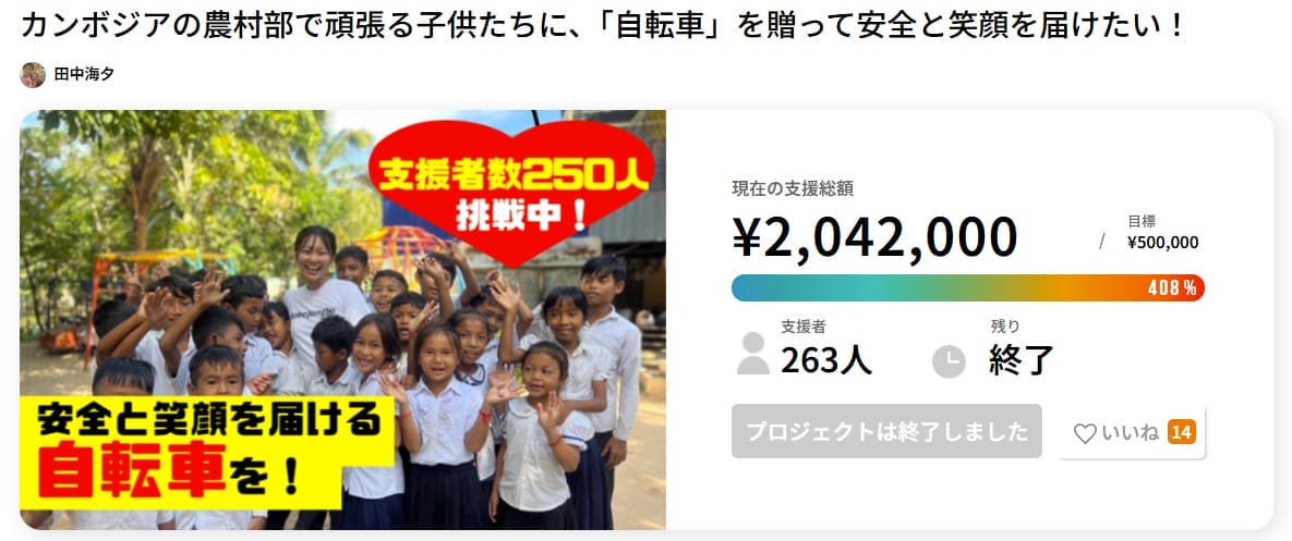 結果として目標金額60万円を大きく上回る80万円が集まったプロジェクトとなっています。