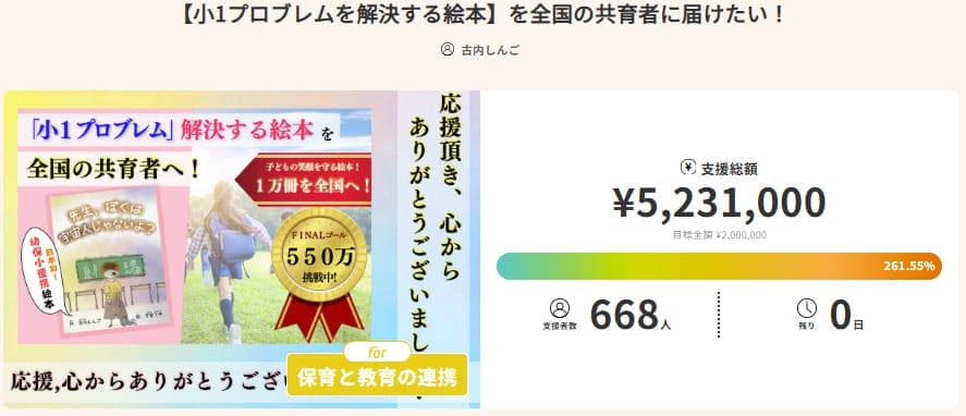 リターンには手作り絵本や感謝メッセージのほか、支援者の名前で保護施設や保育園への絵本寄贈も行われ、次世代への優しい循環を生み出しています。