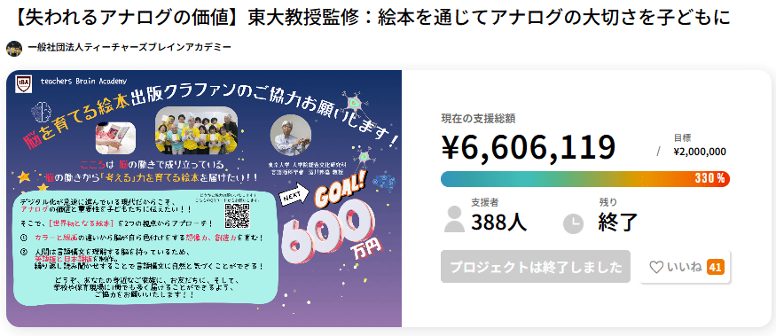 制作には脳科学の専門家やプロのイラストレーターが参加し、リターンには絵本や朗読体験など、読者が作品世界に深く関われる工夫がされています。