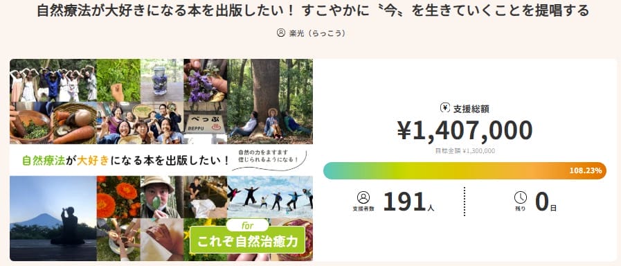今回のプロジェクトを立ち上げた楽光さんは、20年間日本全国を旅している内に〝自然療法″が生活の知恵からきているものだということを確信し、この知恵を多くの人々に伝えていきたい想いからクラウドファンディングで本の出版に挑戦されました。