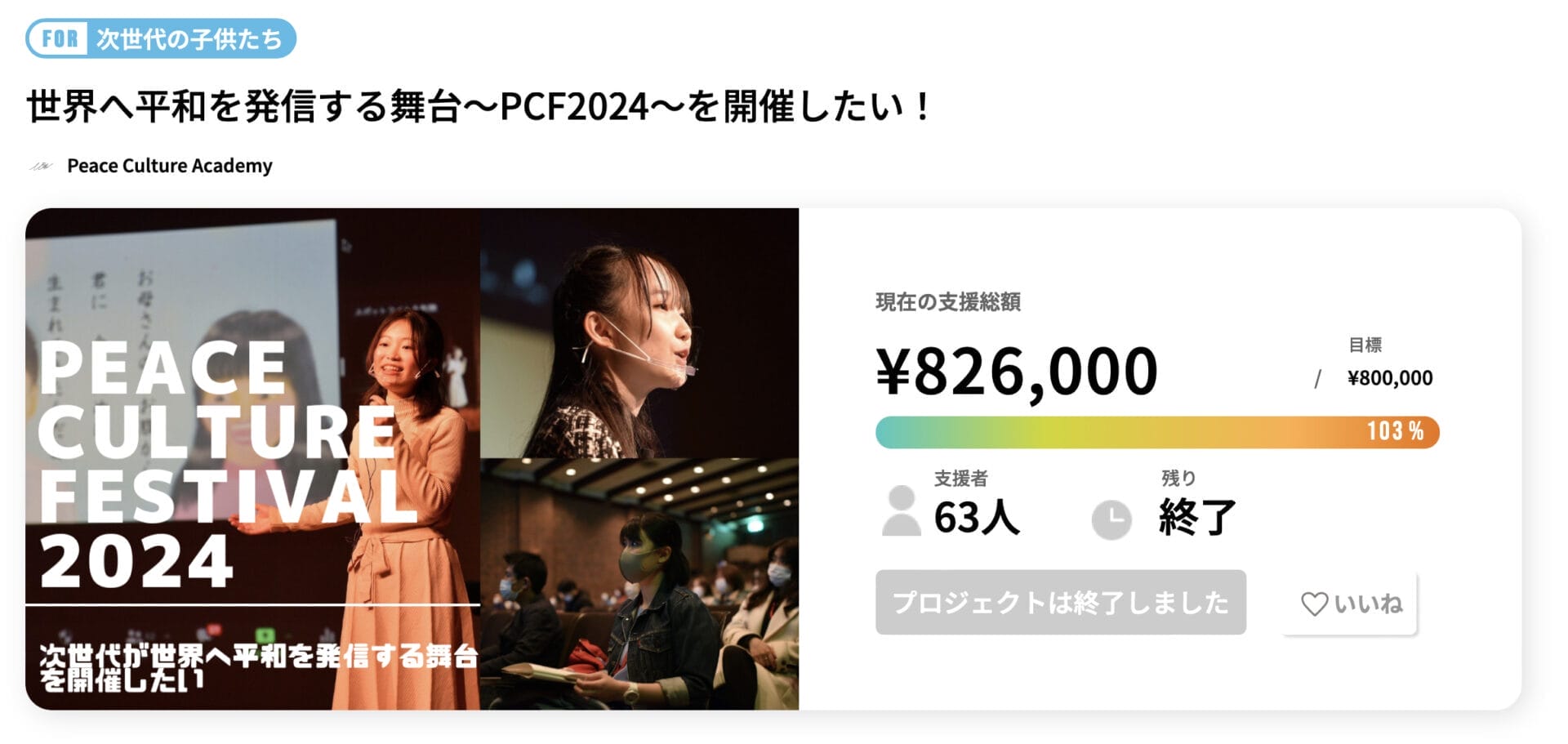 ➡ 詳細を見る 世界へ平和を発信する舞台〜PCF2024〜を開催したい!|For Good|手数料0%のクラウドファンディング