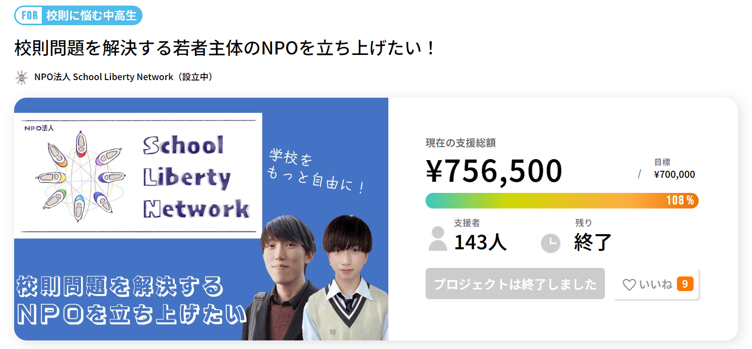 こちらは中高生が校則問題に取り組むためのNPO「School Liberty Network」を設立するためのプロジェクトです。理不尽な校則に悩む学生がオンラインで相談できる場を提供し、校則の見直しを通じて学校をより自由で民主的にしたいと考えています。