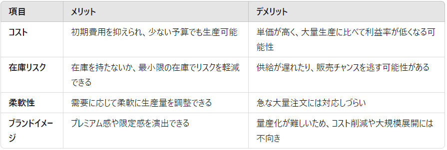 ここでは、小ロット生産におけるメリットとデメリットを表で比較し、どのように活用するかを考えてみましょう。
