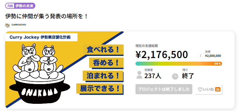 「CURRYJOCKEY」は、伊勢市で地元食材を使用したカレーを提供し、音楽と共に地域交流の場を作るカフェの開設を目指すプロジェクトです。