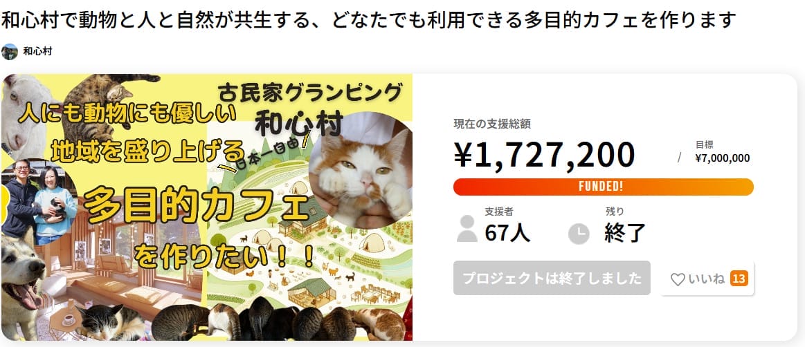 今回はクラウドファンディングで支援を募り、グランピング施設内に、気軽に楽しめて動物にもやさしいカフェの開設を目指しています。