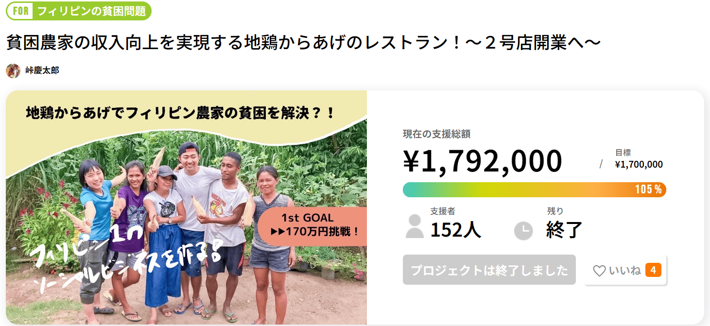 このクラウドファンディングは、フィリピンで開業した地鶏からあげレストランの2号店開店を目指し発案されました。