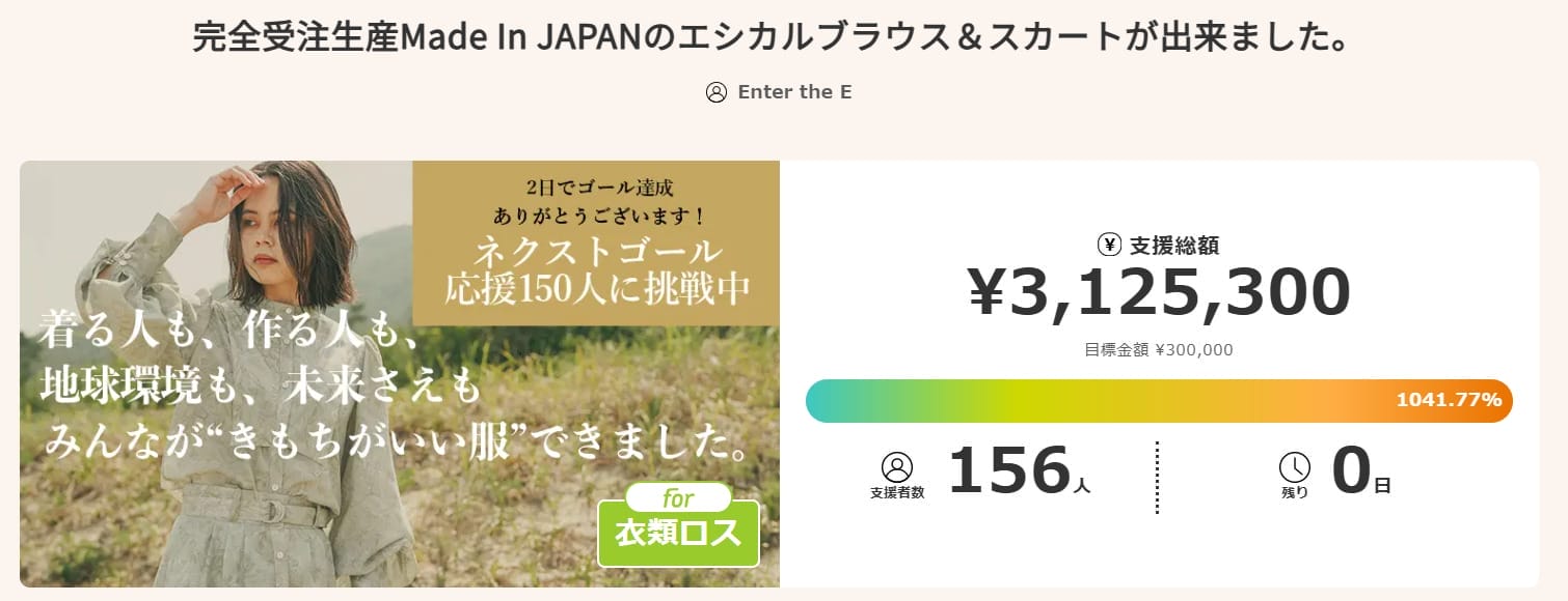 「地球と人が洋服を楽しめる社会の両立」を目指した発案者の想いを多くの人に伝え、リターンには魅力的な商品を豊富に用意することで、目標金額を越える成果を納めました。