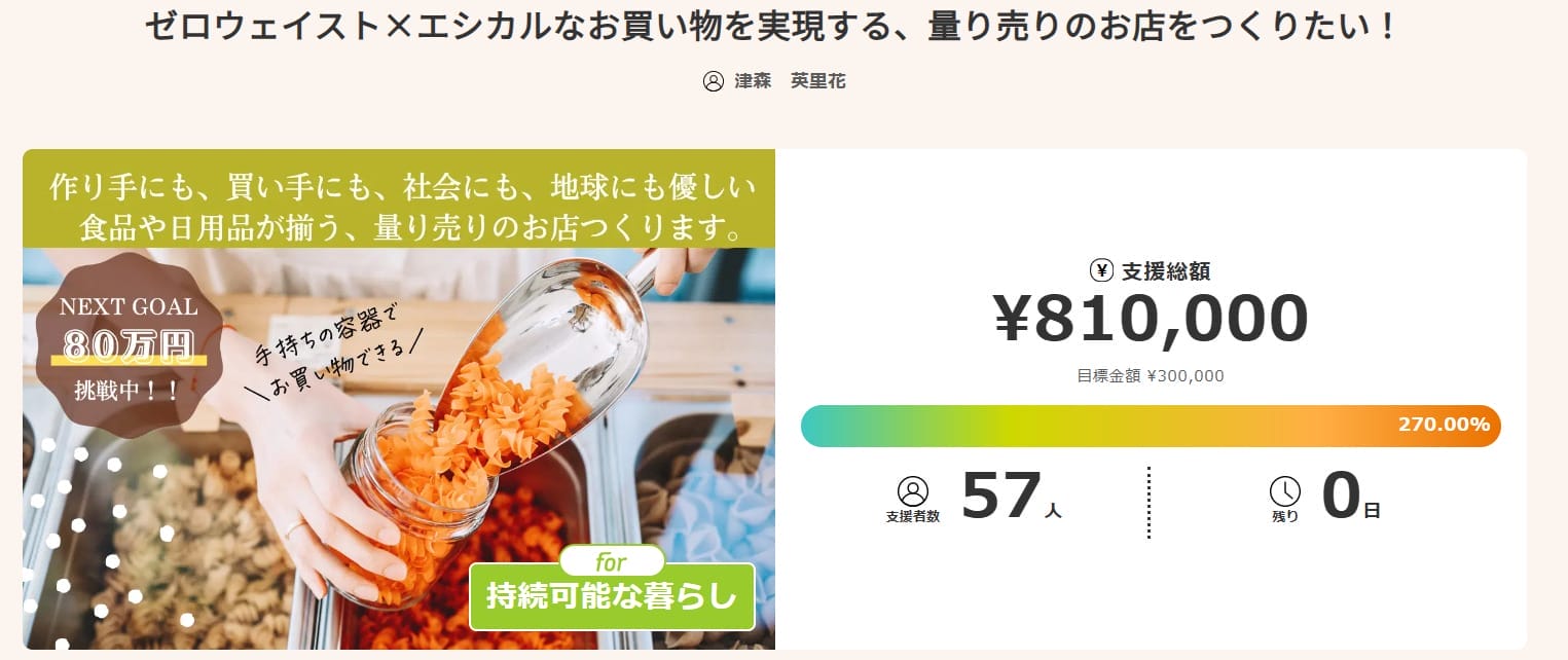 このクラウドファンディングの発案者である女性は、個包装のゴミを出さないスタイルで、食品の量り売りや日用品を販売する店のオープンを目指し、プロジェクトを立ち上げました。
