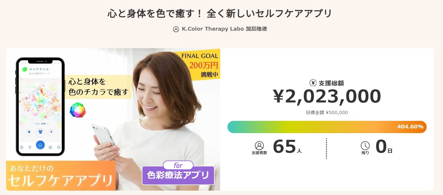 施術は通常、身体にカラーペンでポイントを付けたりシールを貼ったりして行いますが、K.Color Therapy Laboが遠隔でも色彩療法を行えるように取り組んでいることの1つが、アプリの開発です。多くの方に色彩療法のセルフケアを行ってもらうために、より質の高いアプリ開発を目指し、クラウドファンディングに取り組んでいます。