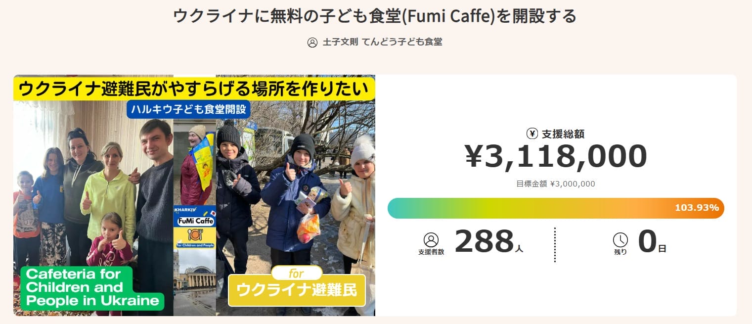 ロシアとの戦争の影響で生活に困窮するウクライナ避難民の、心とお腹を満たせるやすらぎの場所「ハルキウ子ども食堂(Fumi Caffe)」を設立したいという思いから始まりました。