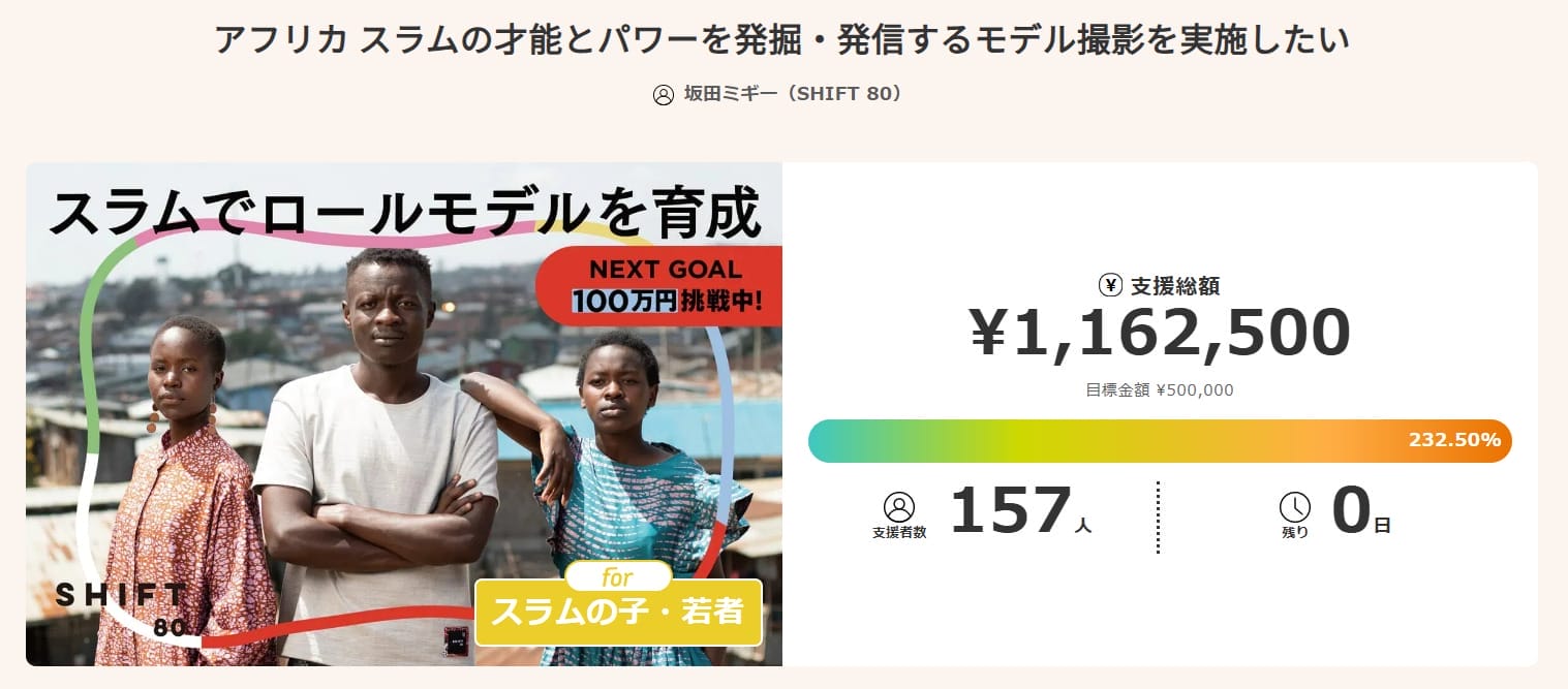 活動の1つとして、クラウドファンディングで開始した取り組みが「スラム街で育った若者をモデル雇用し撮影する」プロジェクトです。