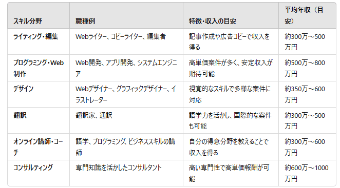 例えば、ライティングや編集のスキルがあれば、Webライターやコピーライターとして活躍できます。プログラミングやWeb制作が得意なら、アプリ開発やシステム構築で高単価案件を狙うことも可能です。また、デザインスキルを活かしてWebデザイナーやイラストレーターとして活躍するのも魅力的な選択肢です。
