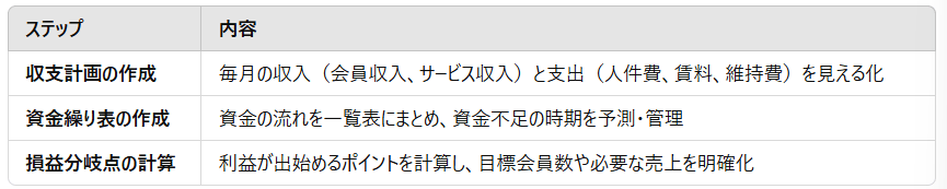 ジムの開業後に安定した経営を維持するためには、以下の3つのステップを踏んだ資金計画が重要です。