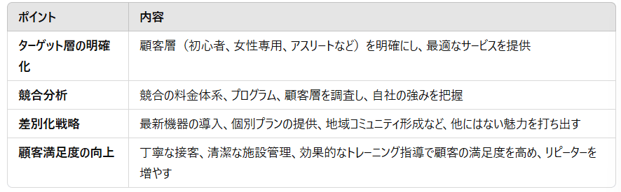ジムを成功させるには、単に施設を提供するだけではなく、戦略的な運営が求められます。以下の要素を押さえることで、他のジムとの差別化を図り、顧客に選ばれる存在を目指しましょう。
