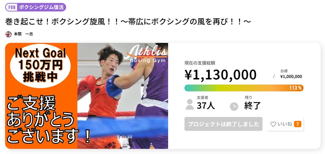 地域の健康促進やコミュニティ形成を目指し、集めた資金をジムの設備投資や選手育成に活用しています。具体的には、ボクシングリングの設置費用として約80万円(リング費用170万円の一部に活用)、リターン準備費用として約20万円、トレーニング器具や用品、遠征費用などに約50万円を充てました。