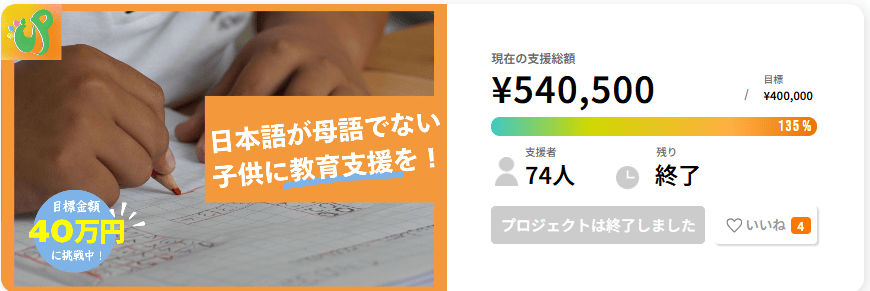 クラウドファンディングで目標金額40万円を超える54万500円を達成し、74人の支援者からの支持を得ました。