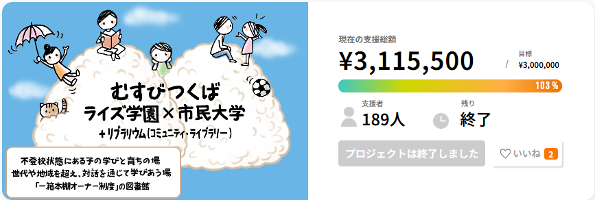 地域全体で子どもたちの成長を支えることを目指しています。クラウドファンディングで目標金額300万円を達成し、189人の支援者からの支持を得ました。