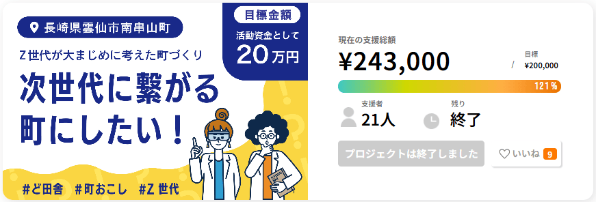 クラウドファンディングで目標金額20万円を超える24万3,000円を達成し、21人の支援者からの支持を得ました。