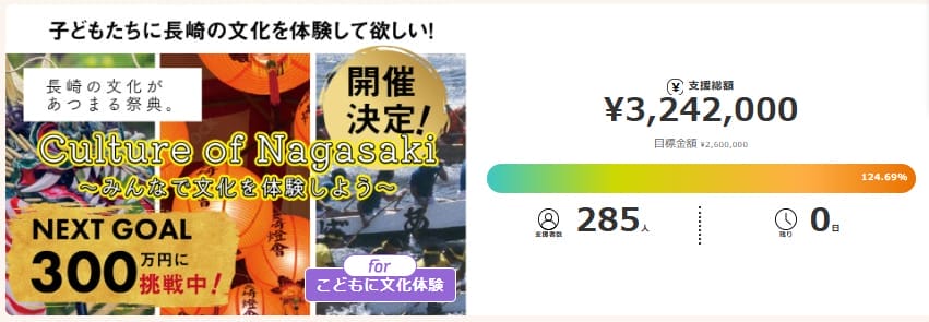 資金集めと集客を同時に行い、目標金額を大きく上回る300万円以上の支援が募りました。