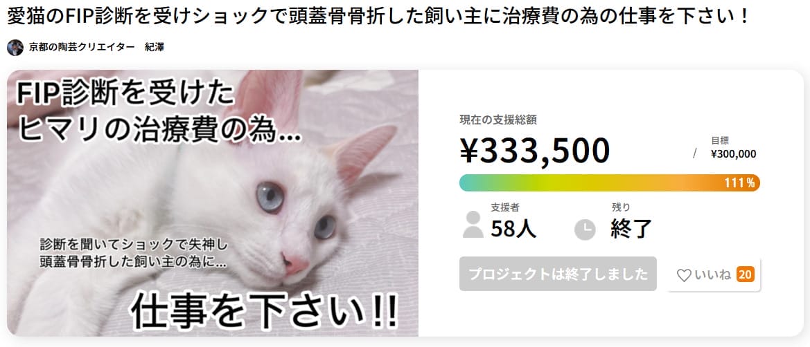 京都で活動する陶芸クリエイターが、スタッフの飼い猫の高額な治療費をまかなうため、自身の人気作品である猫型箸置きを用いたクラウドファンディングに挑戦しました。