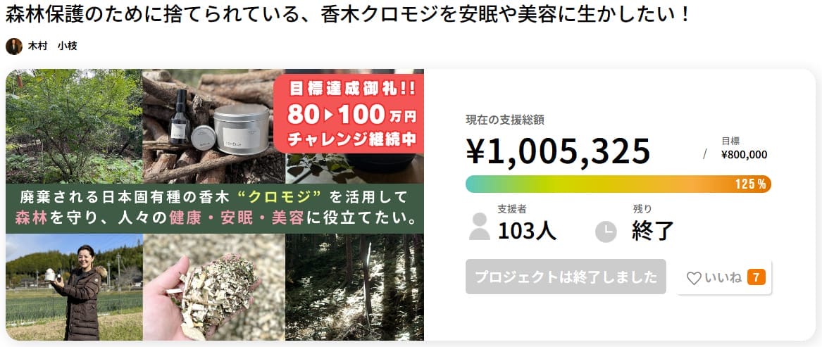 ブランドの立ち上げをクラウドファンディングで行ったことで、社会的な意義に共感する支援者とつながり、持続可能な里山の再生を実現する第一歩となった好例です。