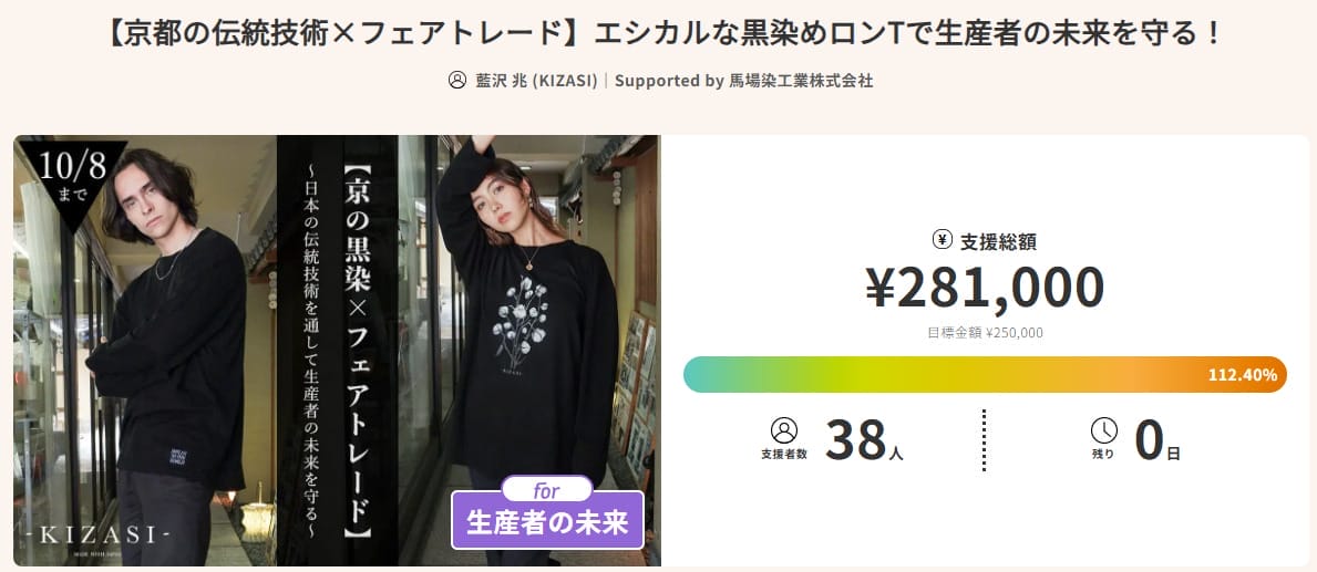 黒染めの魅力や背景、生産者の想いまで丁寧に可視化された訴求力のあるストーリー構成、商品特性を活かしたリターン設計など、アパレル系クラファンを検討している方にとって参考になる点が多くあります。