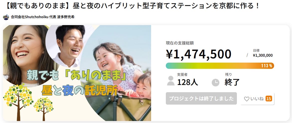 子育てや教育分野でクラウドファンディングを検討している方にとって参考となる事例です。