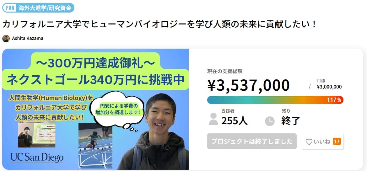 このように、学生本人が学費を集めるだけではなく、学生の親や支援者がプロジェクトを立ち上げる事例もあります。