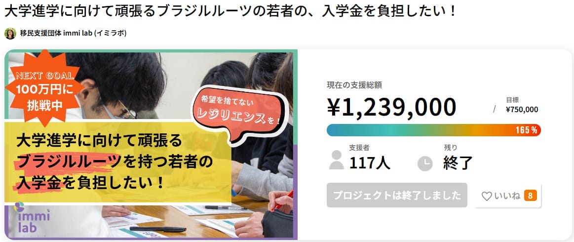 移民ルーツを持つ若者が、大学進学を目指すための入学金を集めるクラウドファンディングプロジェクトです。