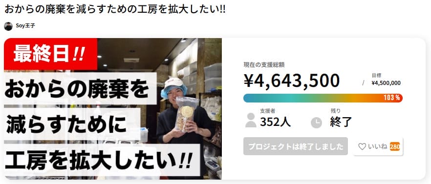 ■PJタイトル名:おからの廃棄を減らすための工房を拡大したい‼︎