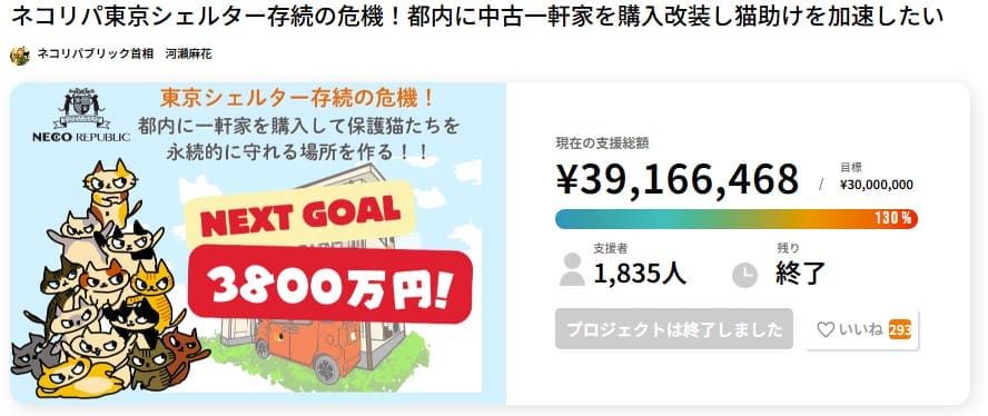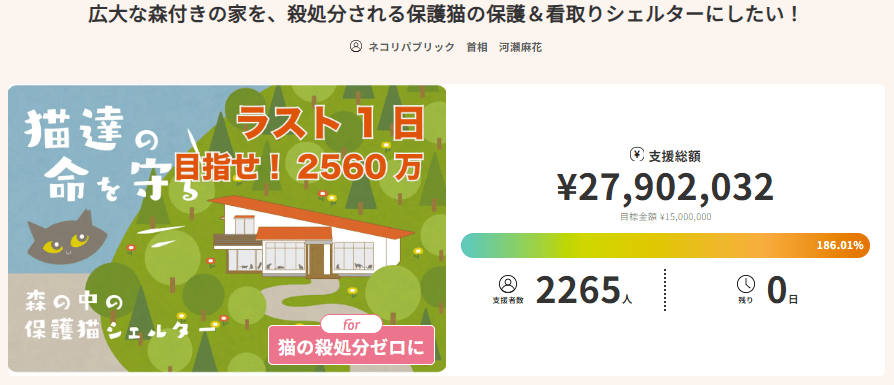 ネコリパブリックという保護猫活動団体では、1回目のクラウドファンディングで「広大な森付きの家を、殺処分対象の猫たちの看取りシェルターにしたい」というプロジェクトに挑戦。