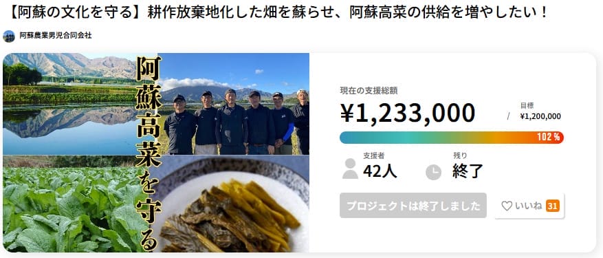 ■PJタイトル名:【阿蘇の文化を守る】耕作放棄地化した畑を蘇らせ、阿蘇高菜の供給を増やしたい!