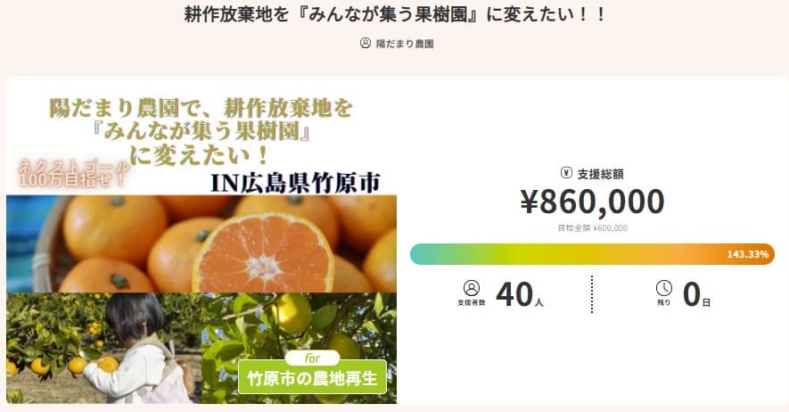 クラウドファンディングを通じて苗木オーナー制度を導入し、参加型で果樹園を育てる仕組みを構築しました。