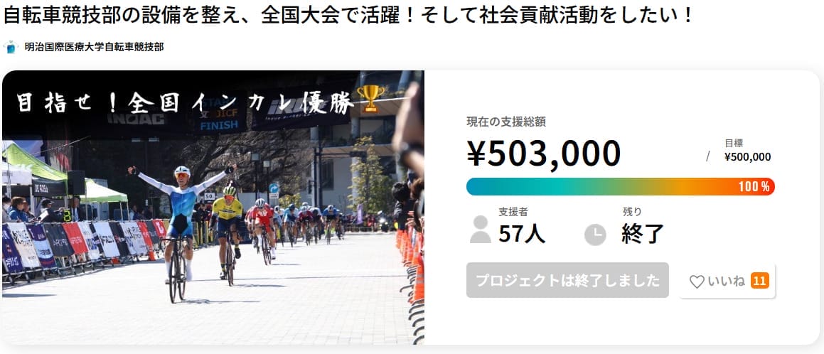 このプロジェクトは、自転車競技部の設備の充実と大会での活躍を目指す内容です。