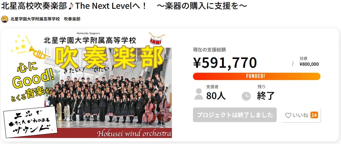 ■ PJタイトル名:北星高校吹奏楽部♪The Next Levelへ! 〜楽器の購入に支援を〜
