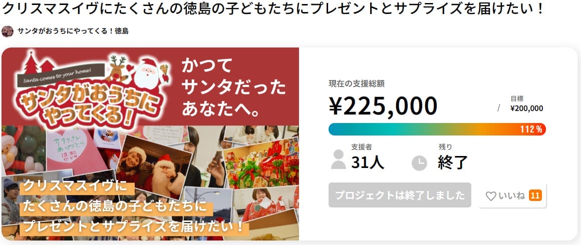 クリスマスイヴにたくさんの徳島の子どもたちにプレゼントとサプライズを届けたい!