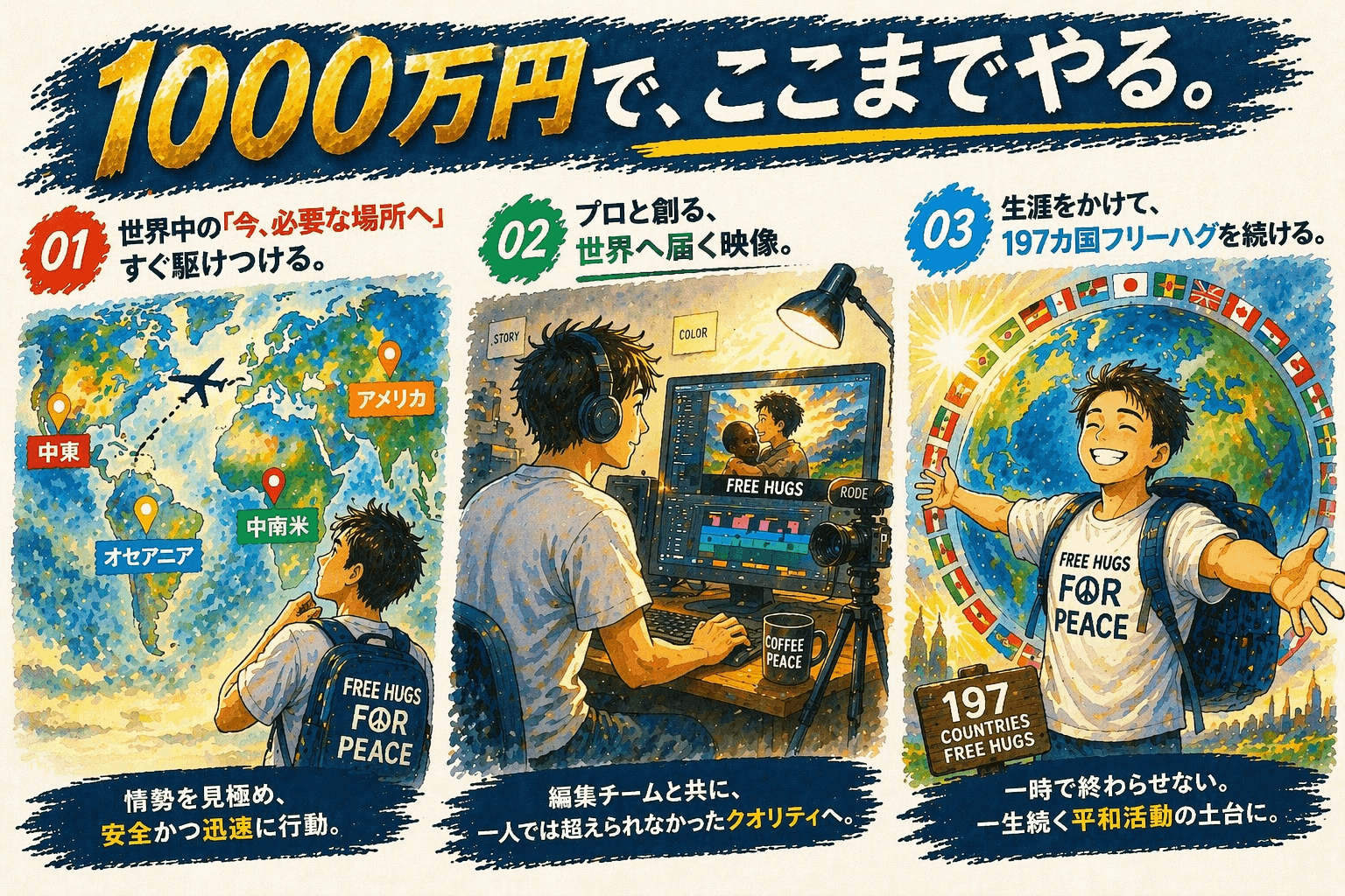 ニュースが報じない平和の体温を、世界中が認めざるを得ない圧倒的な映像作品にアップデートし、世界を驚かせます。