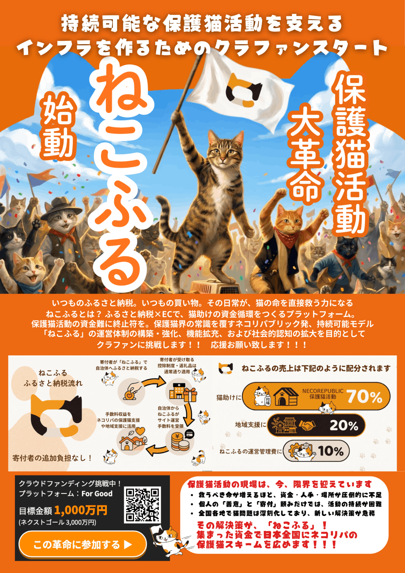 現在のクラファンプロジェクトは、猫助け資金調達大革命!持続可能な保護猫活動を支えるインフラ「ねこふる」始動します