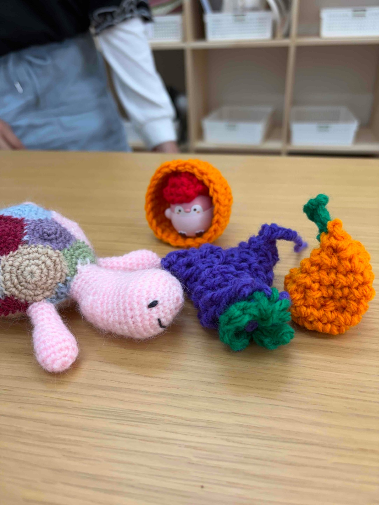 また、本棚の飾りに編み物の小物を置いてくださっている方がいて
