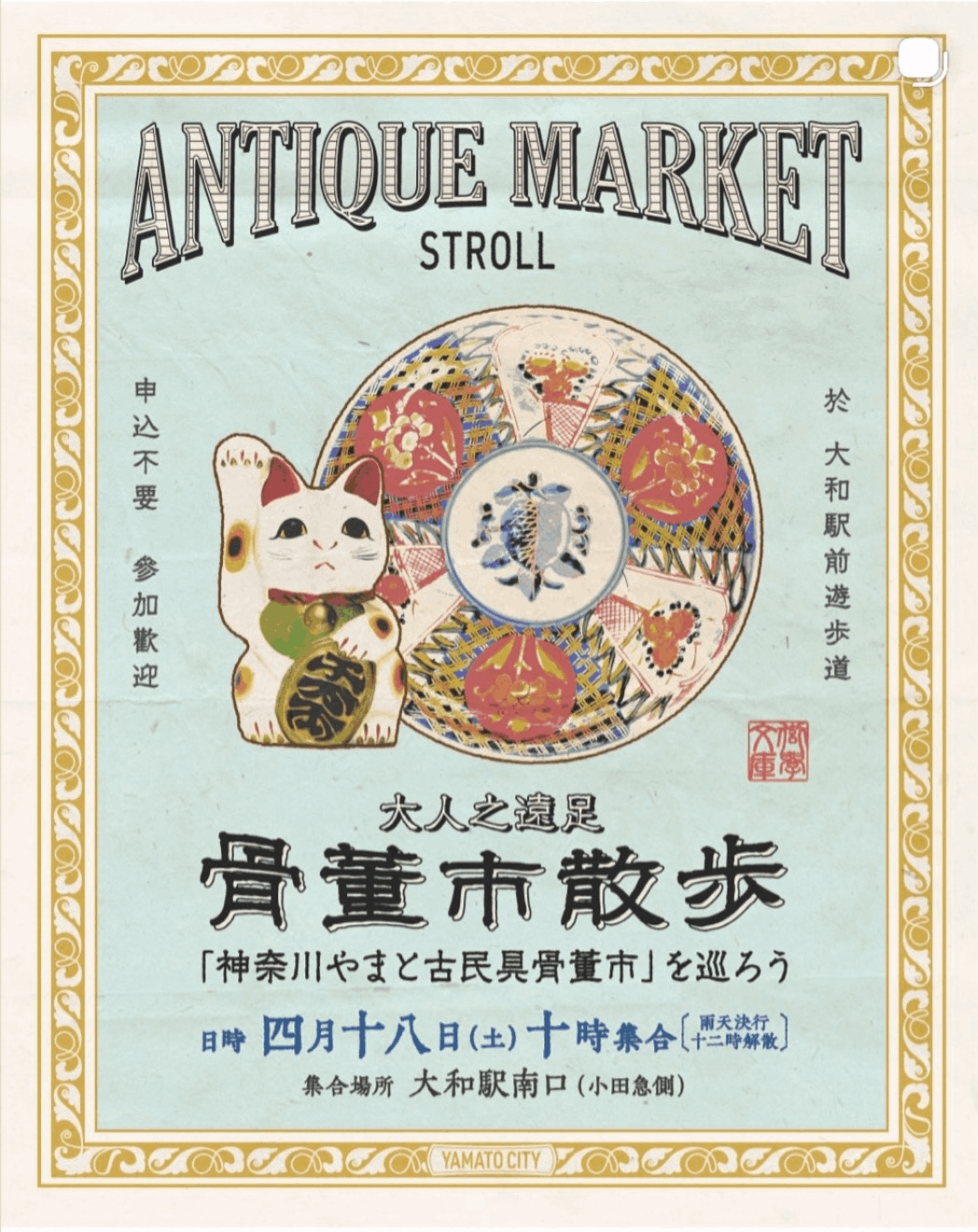 大和に住んでいても、なんとなく骨董市に行く方も、フィーカのオーナー様と一緒に散歩がてらおしゃべりしながらいってみませんか?という遠足です。