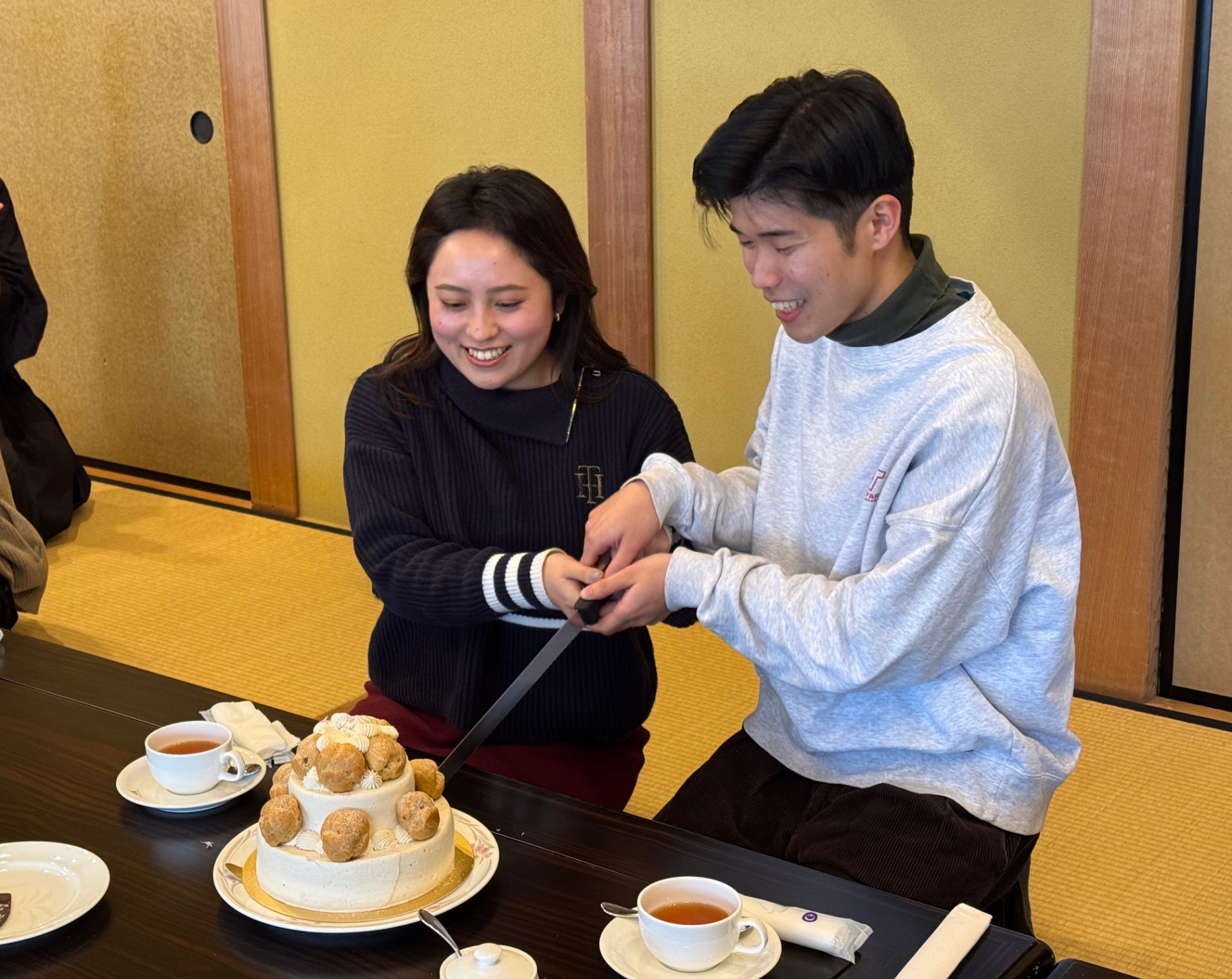 続いて、桜井甘精堂の「泉石亭」2階へ移動しました。実はここで、お二人へのサプライズとして、新婚を祝うケーキを用意していました。「栗の木テラス」店長プロデュースによる特別なケーキで、栗がふんだんに使われ、上品な甘さが印象的でした。
