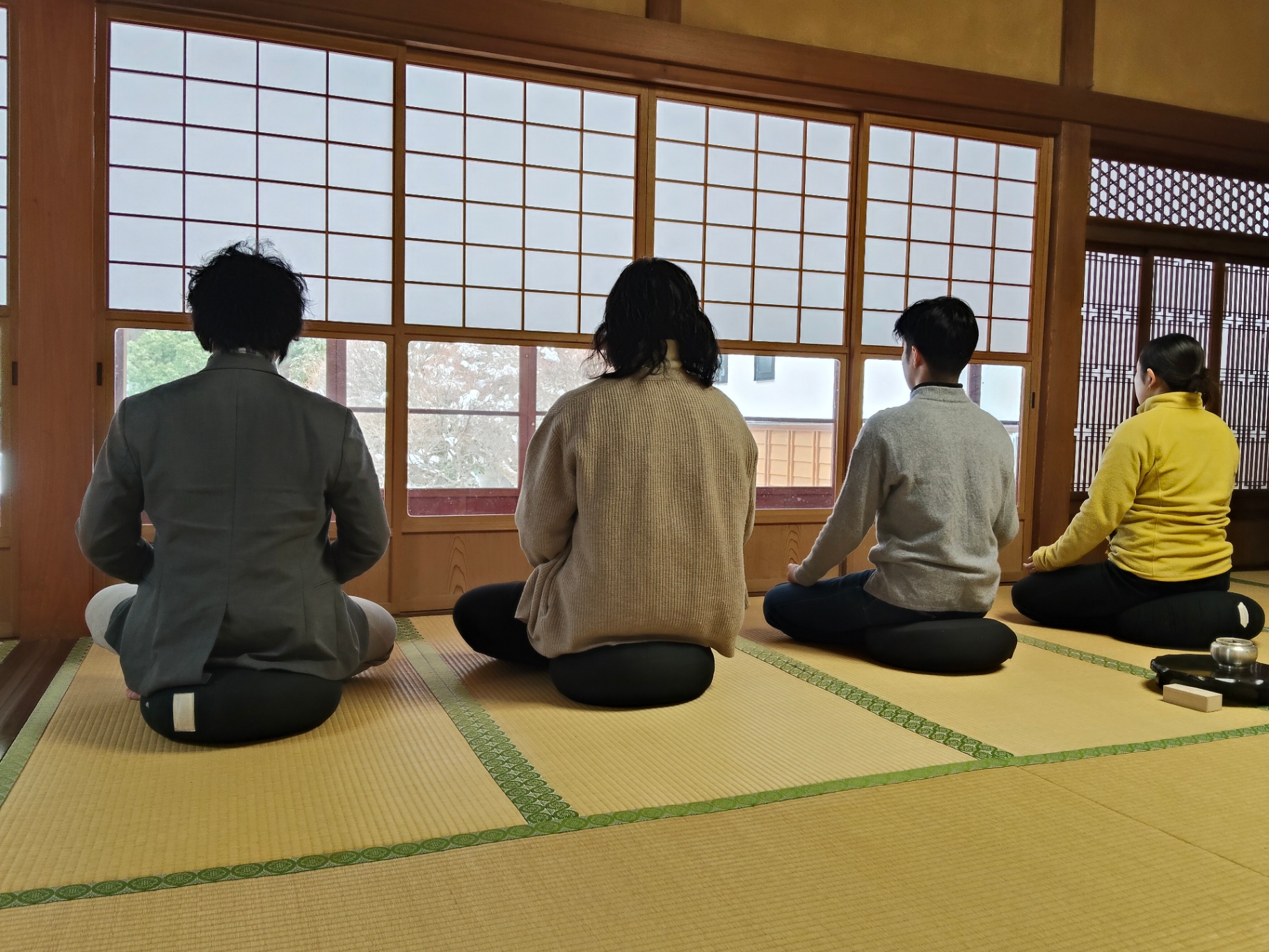 その後、庫裡へ移動し、住職による坐禅のレクチャーの後、みんなで実践しました。雪が綺麗に積もる池のある庭を、雪見障子越しに覗く向きに並び、住職の合図で目を閉じます。