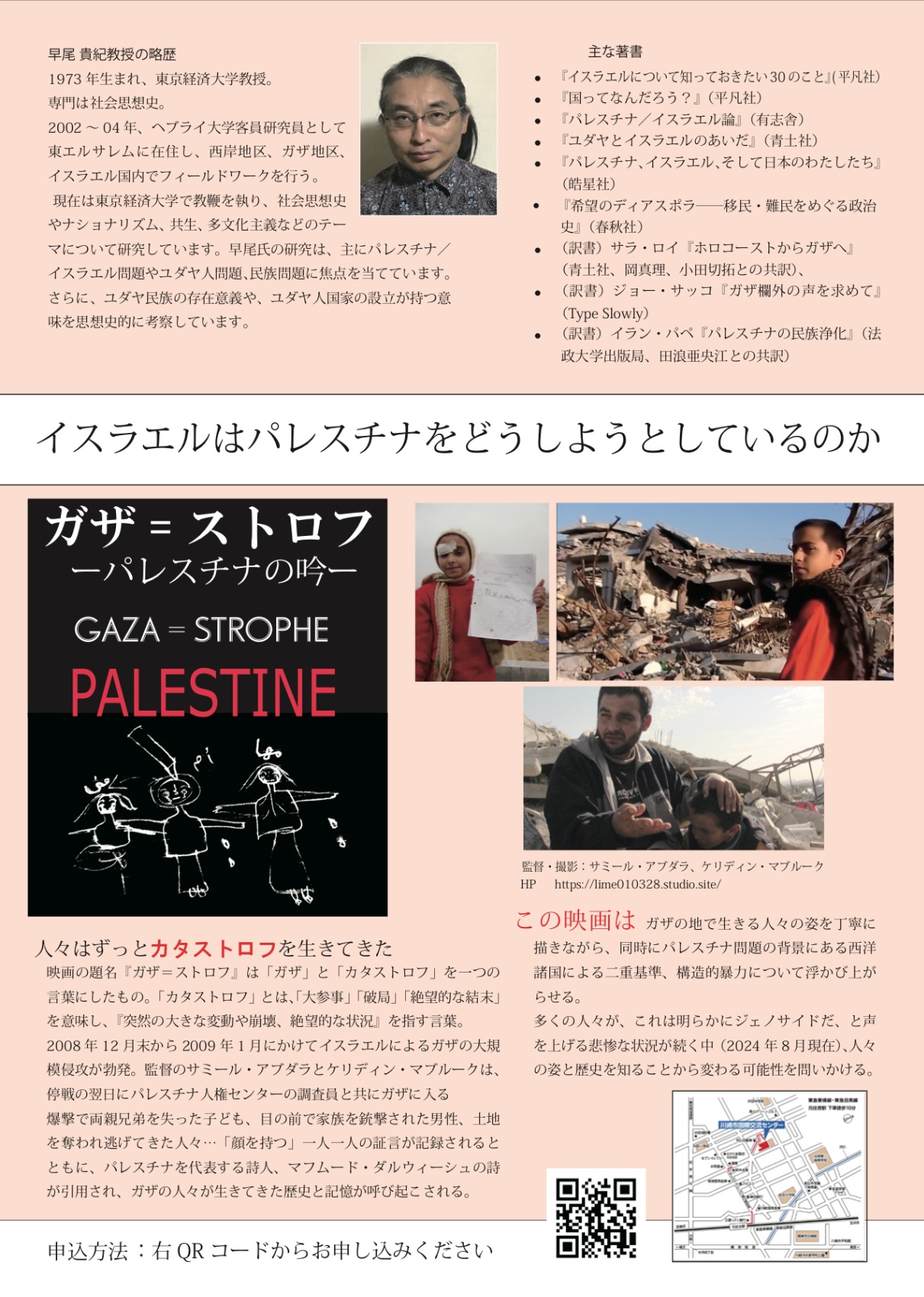 講師は早尾貴紀氏(パレスチナ/イスラエル研究)、今回本作を主催者側に提案いただいたとのことです。早尾さんの解説付きの上映は今までもパレスチナ・ガザについて非常に理解が深まる貴重なものでした。今回はどんなお話しをされるのか、私も勉強のために伺う予定です。どうぞよろしくお願いいたします。