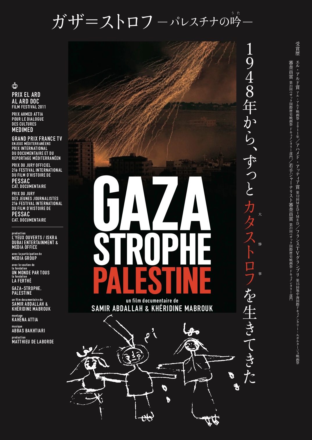 映画の題名『ガザ=ストロフ』は「ガザ」と「カタストロフ」を一つの言葉にしたもの。「カタストロフ」とは、「大参事」「破局」「絶望的な結末」を意味し、『突然の大きな変動や崩壊、絶望的な状況』を指す言葉。2008年12月末から 2009年1月にかけてイスラエルによるガザの大規模侵攻が勃発。監督のサミール・アブダラとケリディン・マブルークは、停戦の翌日にパレスチナ人権センターの調査員と共にガザに入る爆撃で両親兄弟を失った子ども、目の前で家族を銃撃された男性、土地を奪われ逃げてきた人々…「顔を持つ」一人一人の証言が記録されるとともに、パレスチナを代表する詩人、マフムード・ダルウィーシュの詩が引用され、ガザの人々が生きてきた歴史と記憶が呼び起こされる。