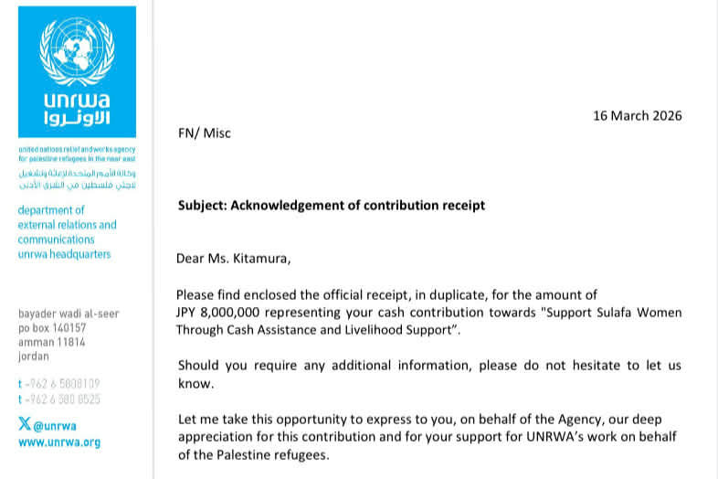 UNRWAから寄付の御礼状をいただきました