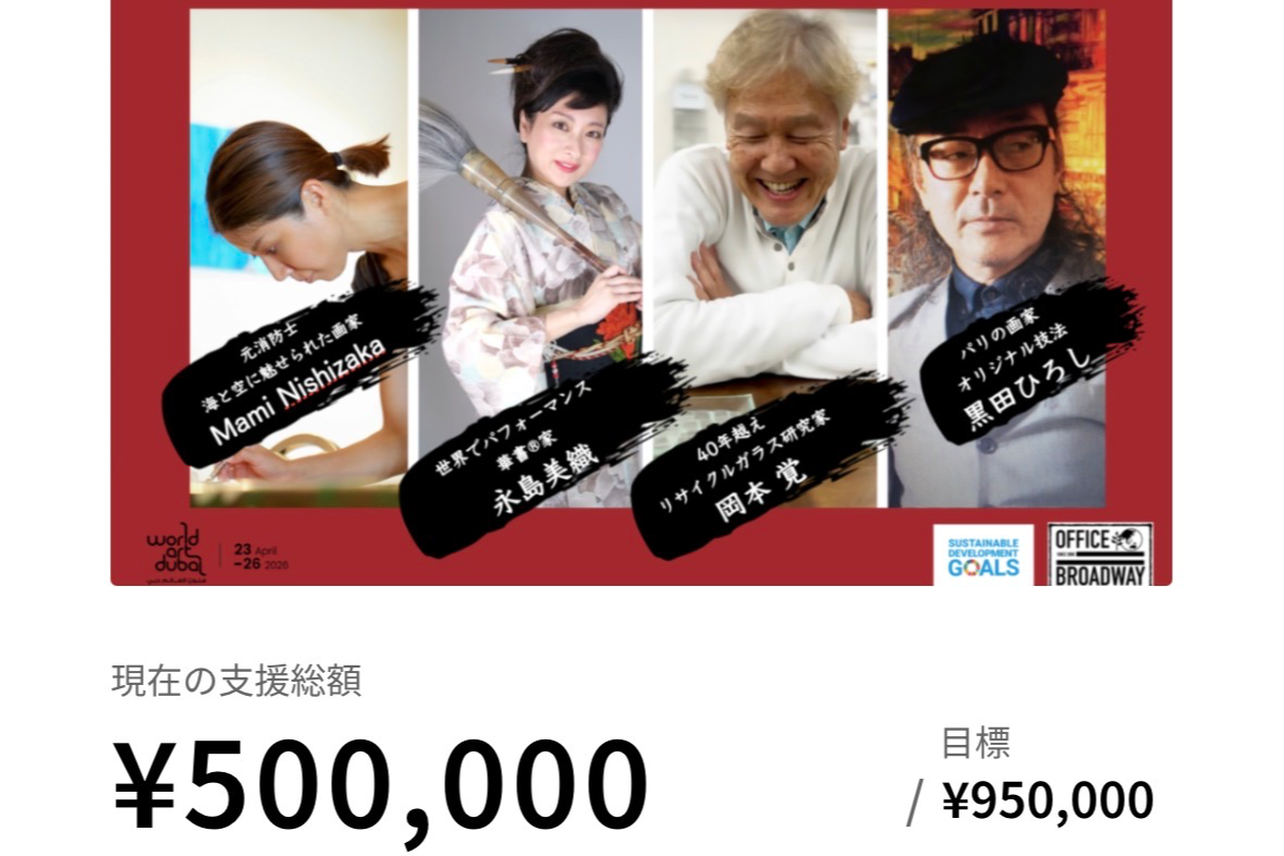 ーオフィスブロードウェイ代表:梅田真紀子が、この目で見て惚れ込んだアーティストさん達に懇願!選び抜かれた方達です①国内外にガラスモニュメントや建築を数々残して来たリサイクルガラス研究家の岡本覚さん②国内外で日本の書道とアートを融合させた華書®︎パフォーマンスし続ける美人書道家の永島美織さん③日本とパリを拠点に独自の技法で素晴らしい風景を描き続ける画家の黒田ひろしさん④元消防士の見れば見るほど魅力に惹き込まれる時空を超えた海や空、風景を描くMami Nishizakaさん。の4人で日本の魅力を伝えるべくワールドアートドバイへ出展します!